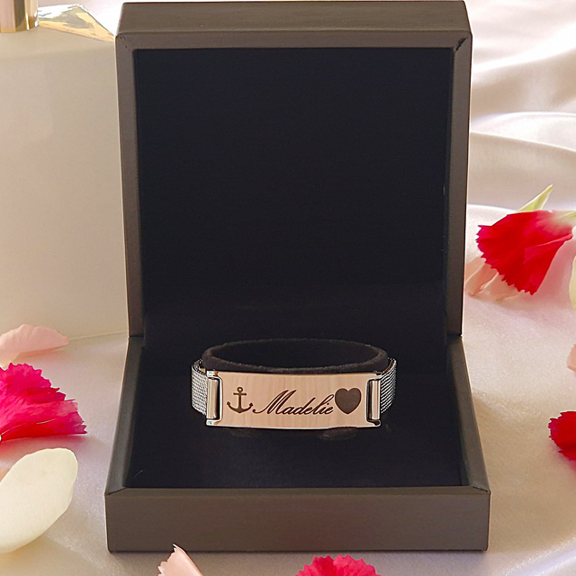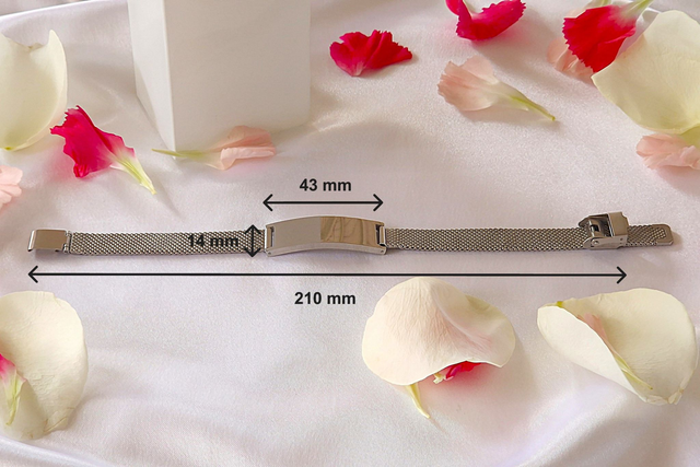 Optez pour un bijou qui reflètera votre personnalité ou pour un présent unique destiné à un proche ! Ce bracelet entièrement en acier inoxydable ajustable parera tout poignet avec élégance durablement. Une gravure personnalisée est réalisable sur le curseur rectangulaire. Nous proposons des polices pour l'écriture et des motifs à sélectionner.