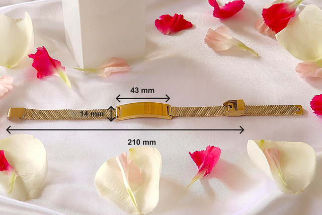 Optez pour un bijou qui reflètera votre personnalité ou pour un présent unique destiné à un proche ! Ce bracelet entièrement en acier inoxydable ajustable parera tout poignet avec élégance durablement. Une gravure personnalisée est réalisable sur le curseur rectangulaire. Nous proposons des polices pour l'écriture et des motifs à sélectionner.