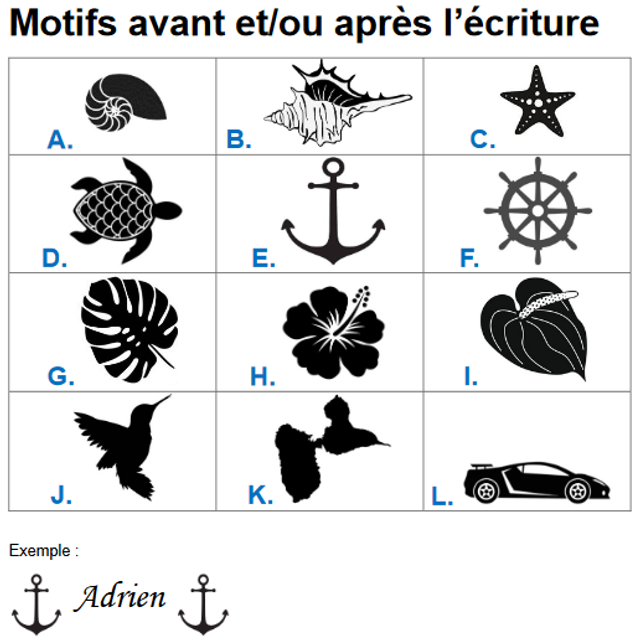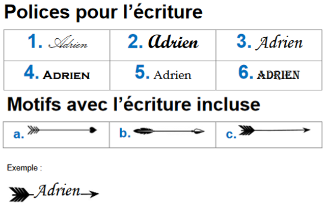 2) Indiquer les motifs et le texte à graver avec le numéro de police dans la partie « Message à l’attention du commerçant ». Exemple : motif b + « Nathalie » (police 2) + motif J