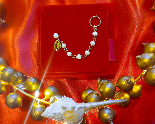 Cette magnifique mono boucle d'oreille est une création faite main avec amour unique en son genre. Elle se compose d'un clou d'oreille avec une perle d'eau douce et d'un pendentif cauri (kaparda en sanskrit) en acier inoxydable doré. De plus, elle possède une chaine constituée de perles d'eau douce qui se fixe à l'oreille avec un anneau ne nécessitant pas de perçage à l'helix. Réveillez le côté edgy qui sommeille en vous avec ce bijou audacieux et anticonformiste qui fera tourner les têtes !